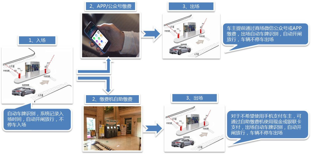 臨時車輛車牌識別不停車進(jìn)場,手機/自助繳費機自助繳費后不停車出場,給臨時車輛帶來極佳的停車體驗。