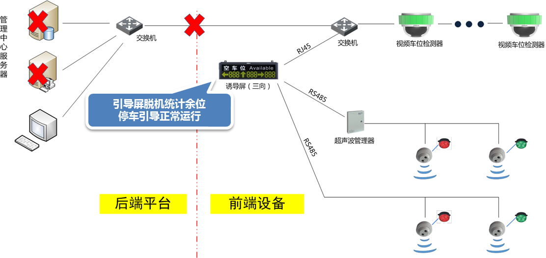 管理服務(wù)器故障或網(wǎng)絡(luò)異常時,引導(dǎo)屏脫機統(tǒng)計余位,停車引導(dǎo)系統(tǒng)仍可正常運行。